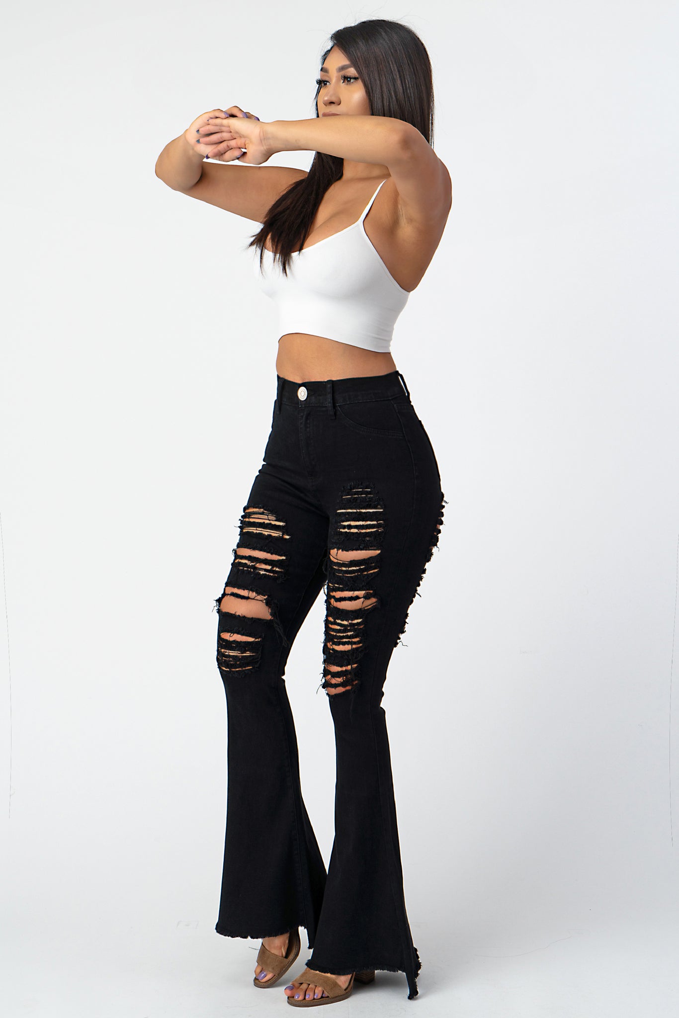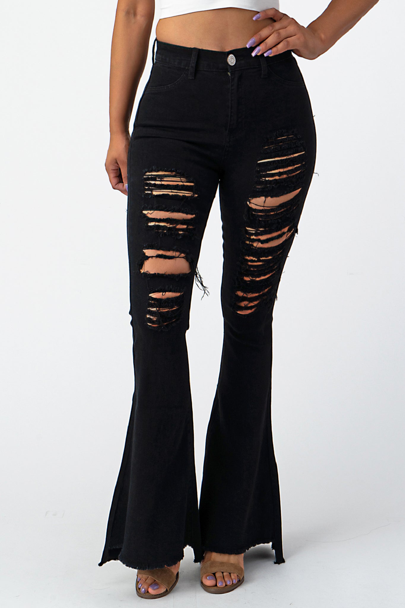 Destroyed Flare Pants Black Denim Jeans Medium Size .