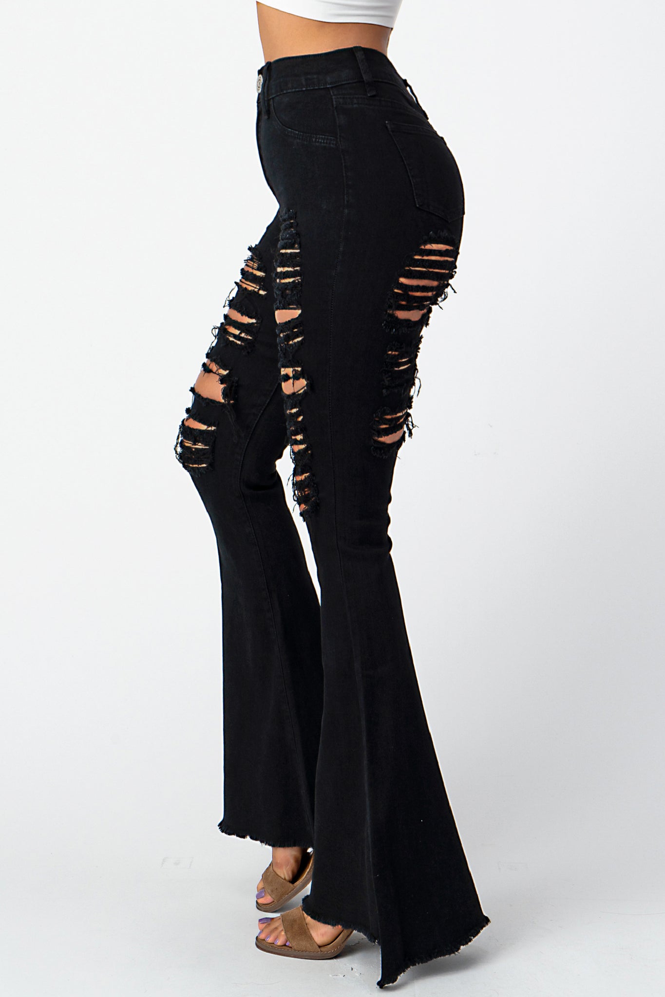 Destroyed Flare Pants Black Denim Jeans Small Size .