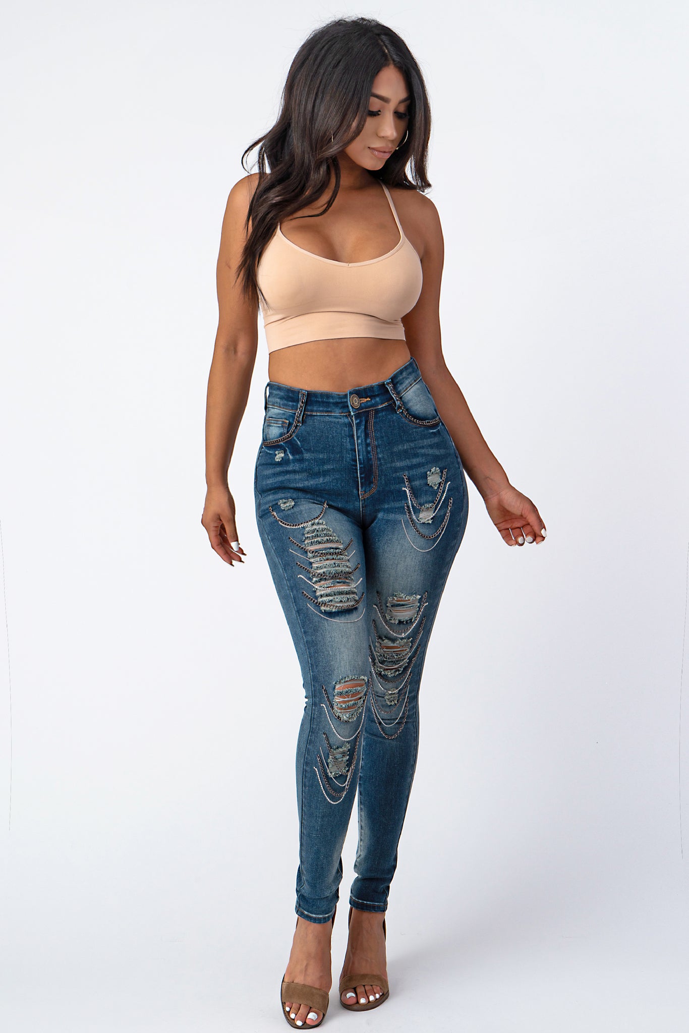 Destroyed Pants With Chain Front Md Denim Jeans.