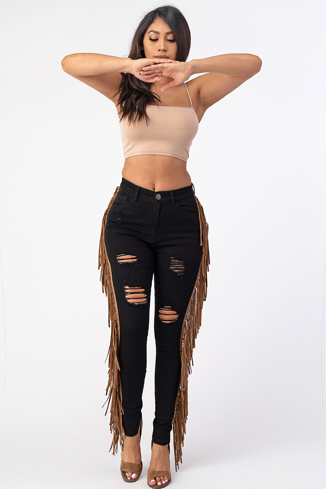 Destroyed Pants With Leather Tassel Black Denim Jeans Small