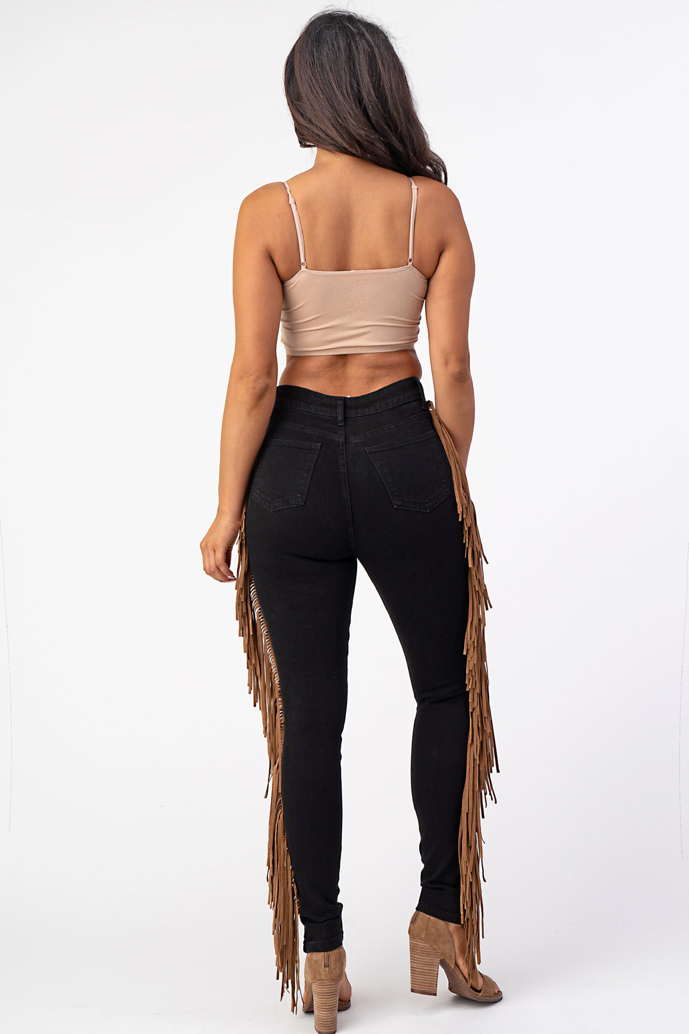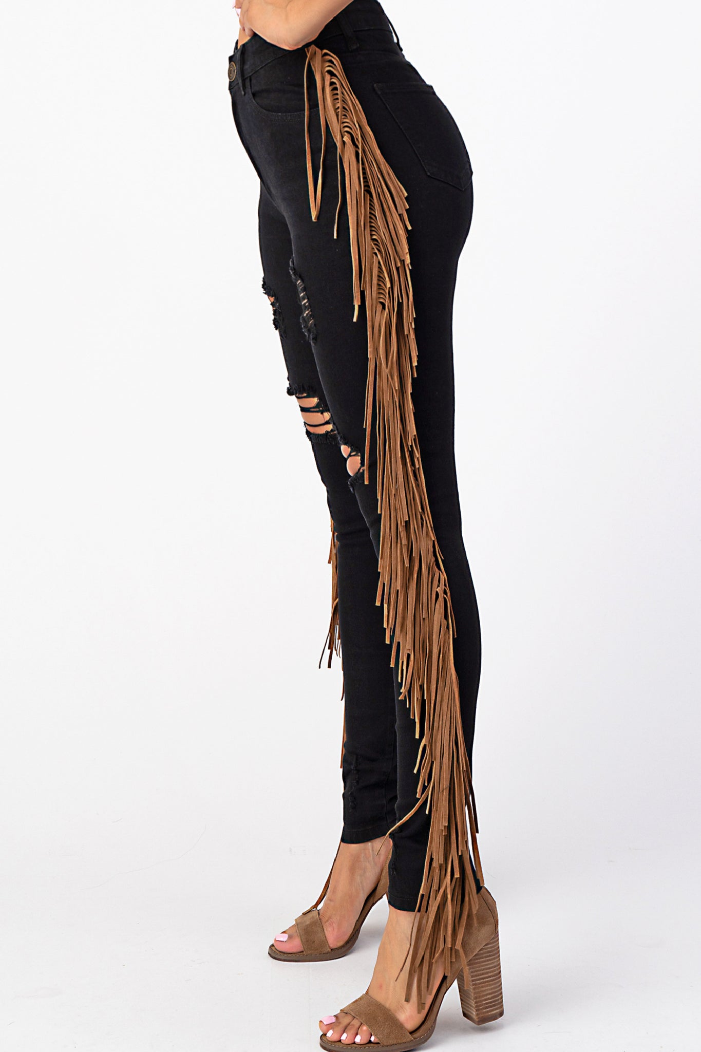 Destroyed Pants With Leather Tassel Black Denim Jeans X- Large
