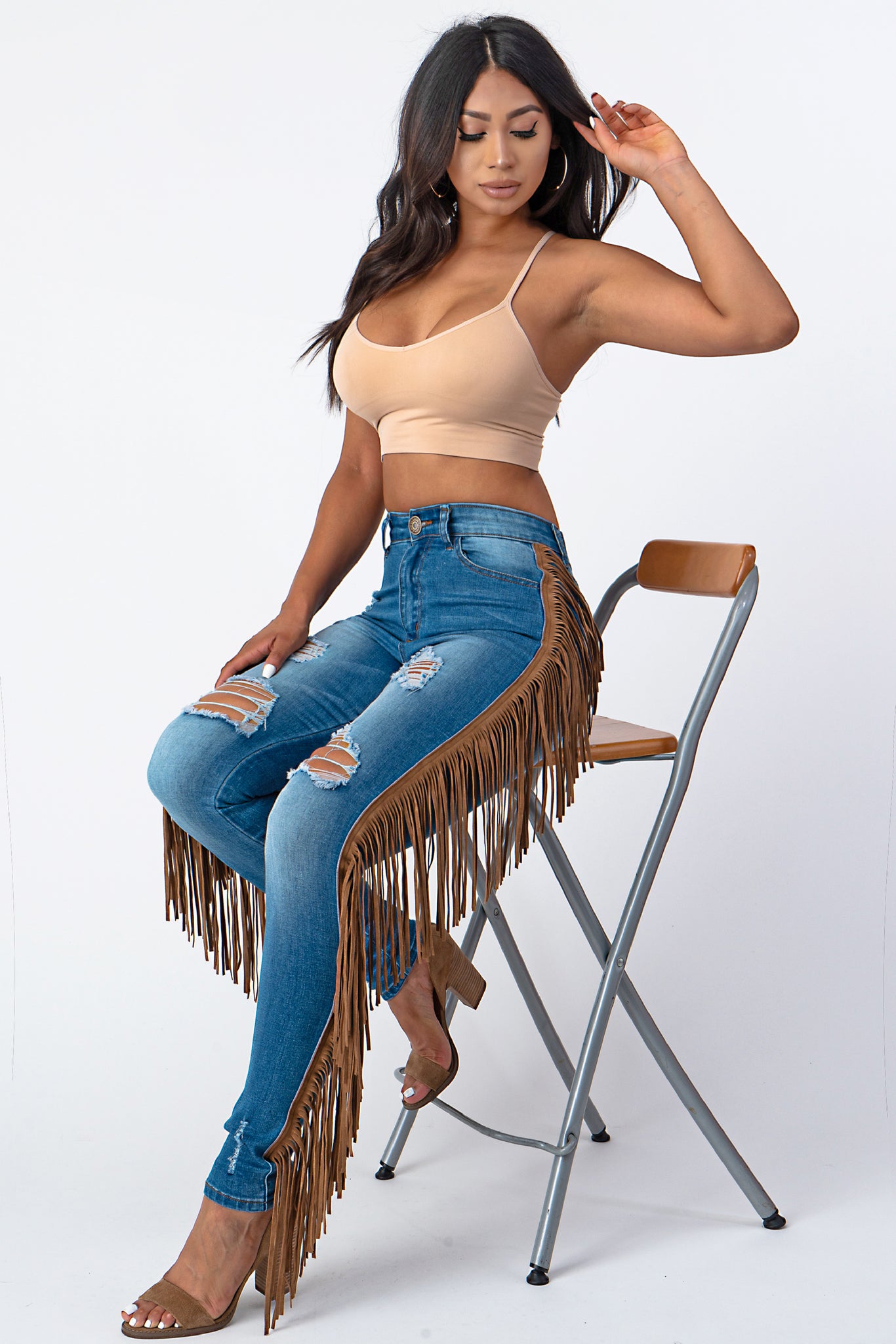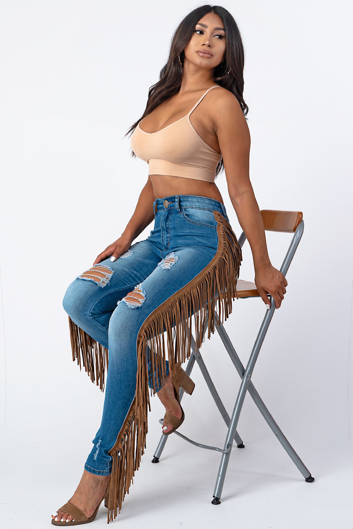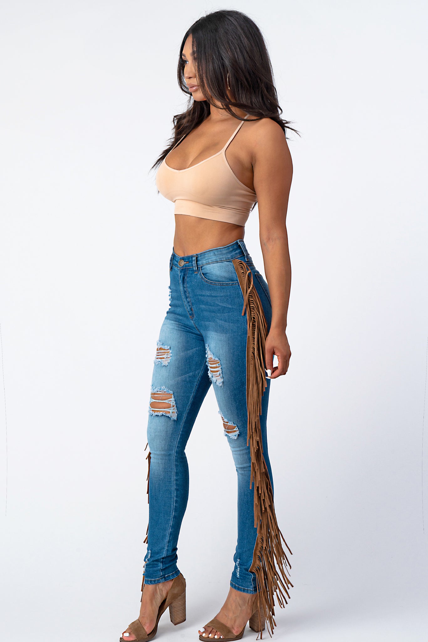 Destroyed Pants With Leather Tassel Medium Denim Jeans .