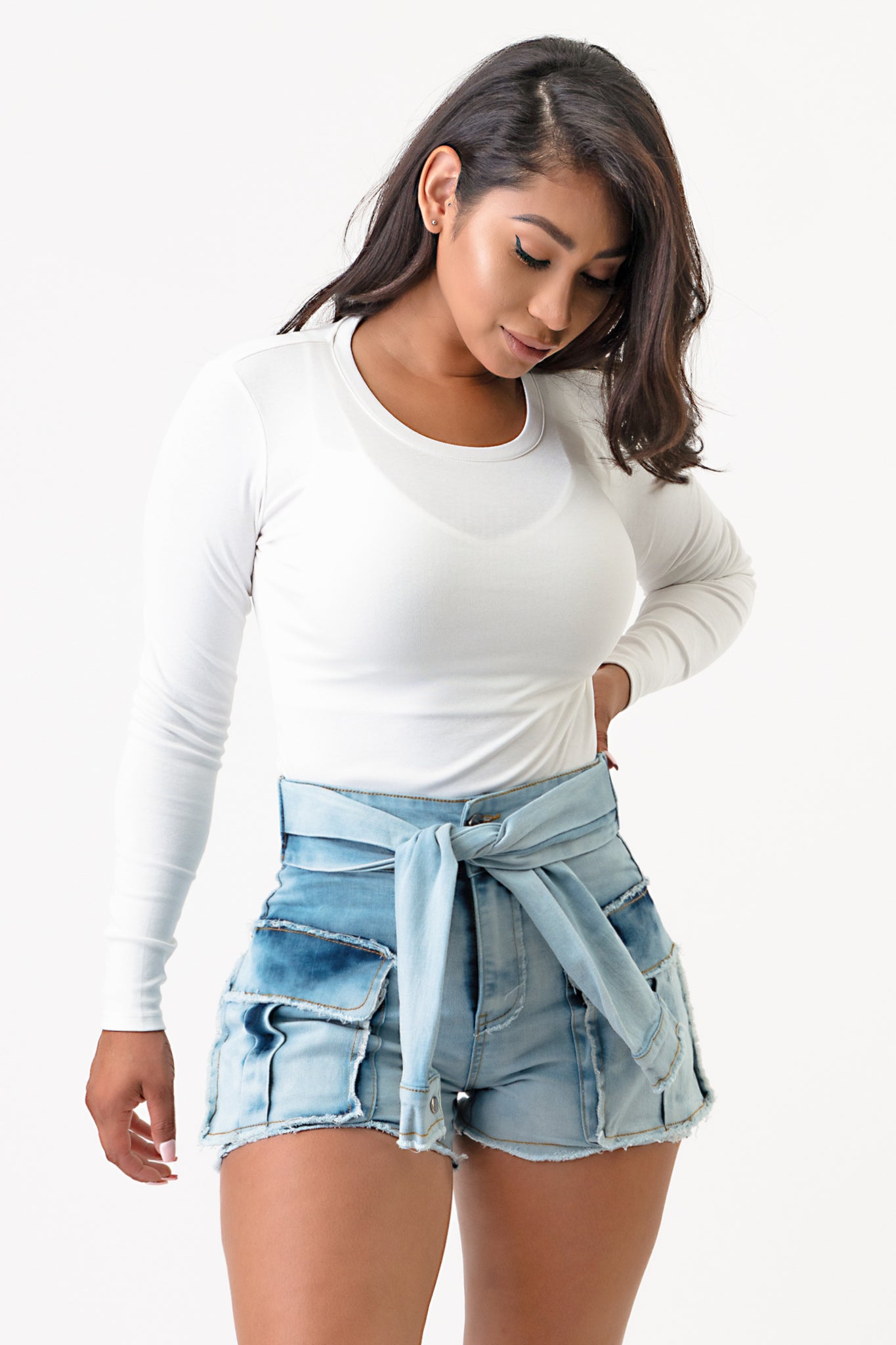Sleeve Front Cargo Shorts- Acid Light Denim Jeans .